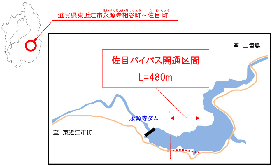 滋賀県は3月20日10時、国道421号(佐目BP)東近江永源寺相谷町~東近江市佐目町、(延長約480m)を開通する。