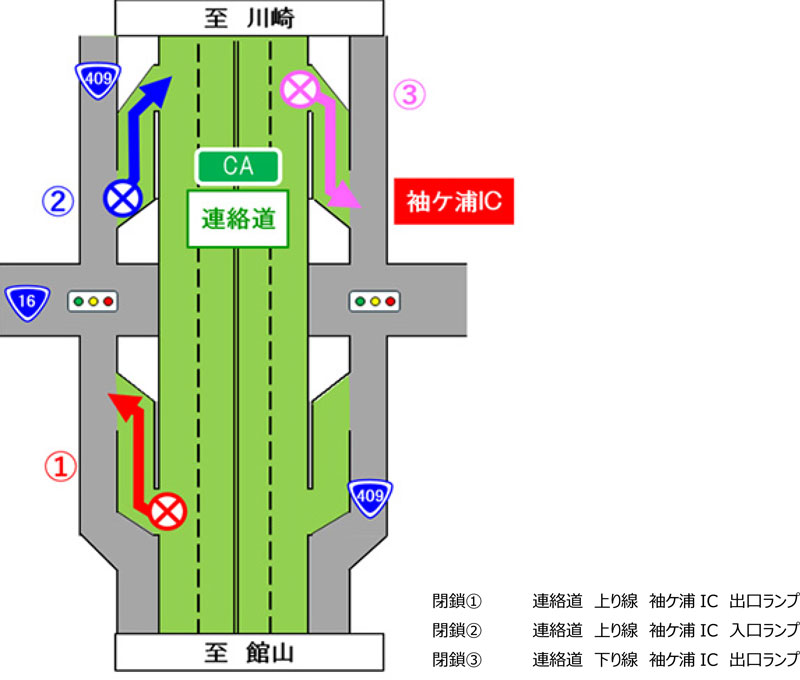 NEXCO東日本は、東京湾アクアライン連絡道・袖ケ浦ICのランプを、舗装補修工事のため、順次、夜間閉鎖する。