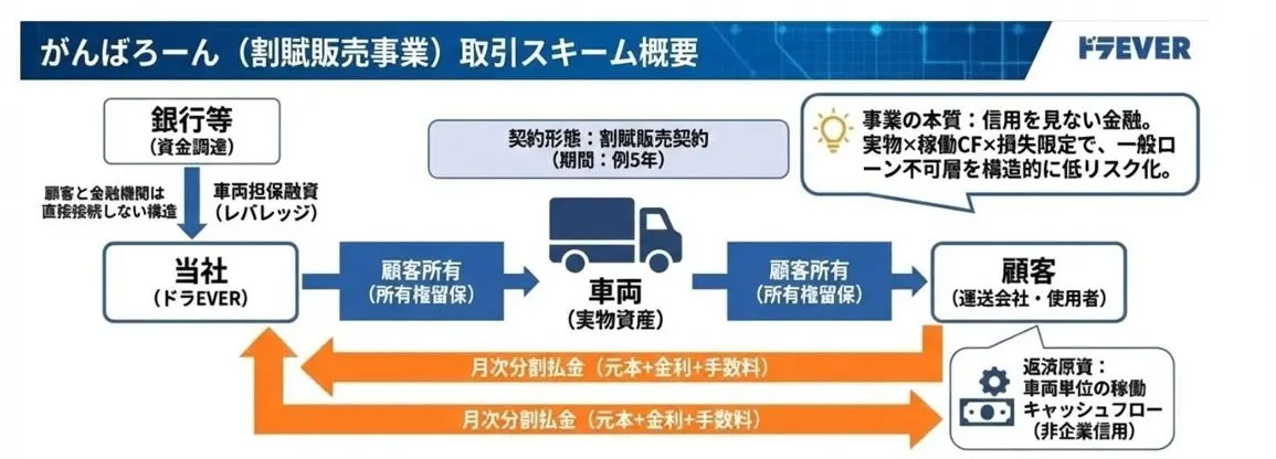 「がんばろ~ん」は、企業信用ではなく車両単体の稼働収益を評価する割賦販売。同社が保有する実物資産(車両)を提供する「所有権留保特約付き売買」となる。「実物資産×稼働キャッシュフロー×損失限定」という独自のスキームにより、これまで車両調達が困難だった層の低リスク化を実現するサービス。
