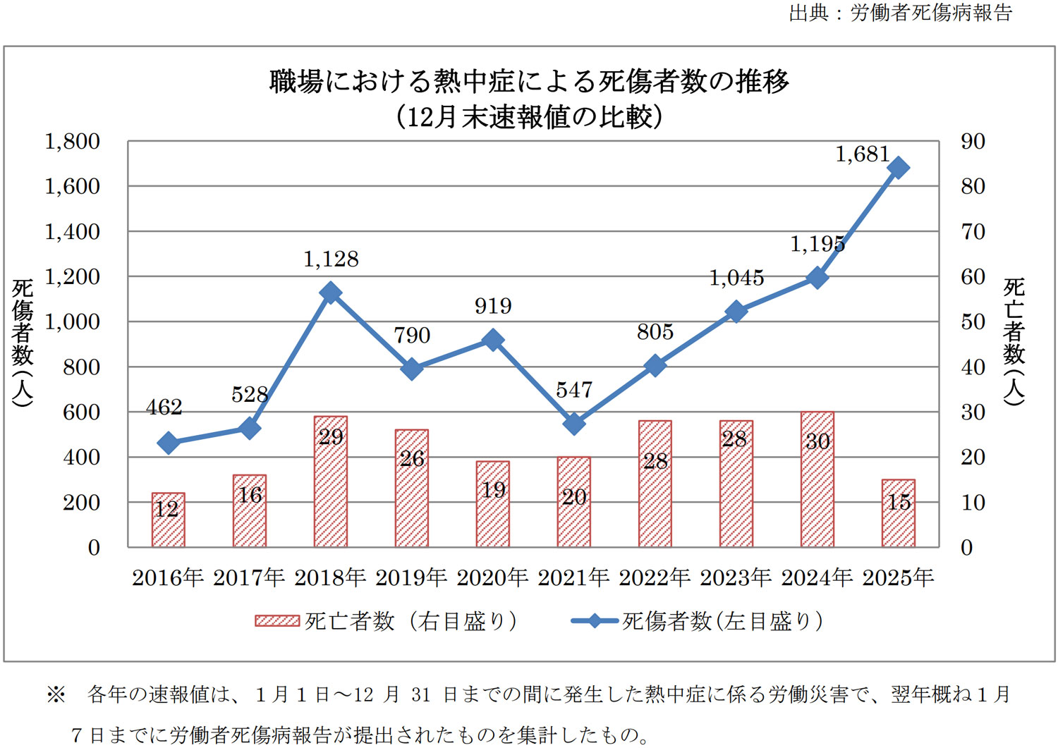 厚生労働省はこのほど、2025年職場における熱中症による死傷災害の発生状況の速報値を発表した。速報値では、死亡を含む休業4日以上の死傷者数は1681人、うち死亡者数は15人となった。死亡者数は減少したものの、死傷者数は前年比約4割の大幅な増加となっており、業種別にみると、死傷者数については、製造業が最も多く、建設業、商業、運送業、警備業が続いた。