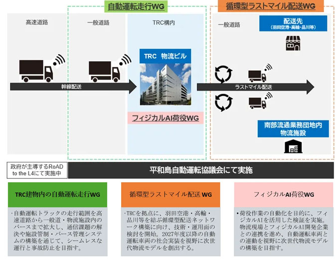 現在、TRC建物内の自動運転走行、循環型ラストマイル配送、フィジカルAI荷役の3つのワーキンググループが活動しており、26年度は特にフィジカルAIの活用を重点項目に設定。自動運転トラックと繋がる荷役や搬送までを一体化した物流全体の高度化・自動化に注力している。
