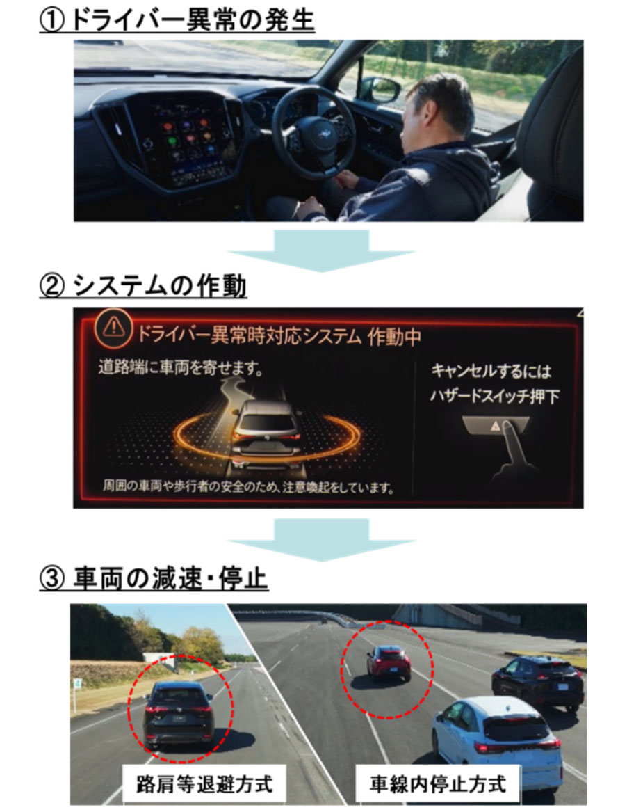 現在、体調急変により、運転中に急にドライバーが安全運転を継続できなくなった際、システムがドライバーの異常を検知して周囲の道路利用者に異常を知らせつつ車両を停止する「ドライバー異常時対応システム」が普及している。