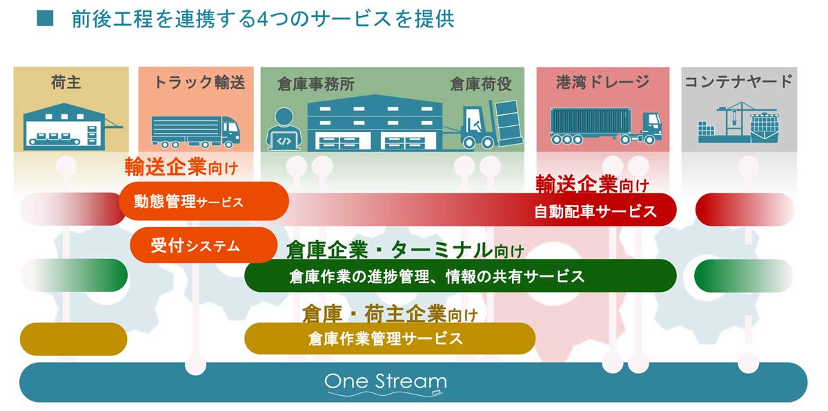 先に触れたように、物流効率化システムは、これまで個社単位での利用を前提としたものが中心だった。これに対してOne Streamは、出発点である荷主から最終地点のコンテナヤードまでを一つの流れと捉え、全体最適化を図るのが特徴だ。