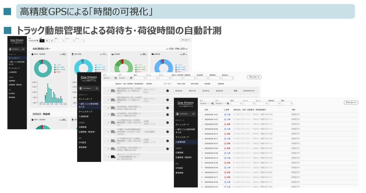 高精度なGPSの情報から、物流施設の敷地への出入りはもちろん、待機場所や荷役場所への出入りも正確に測定することも可能だ。使用するハードはGPSだけなので、トラックドライバーが操作する必要がないのもメリットである。このようなところも、One Streamの「現場目線」らしい。
