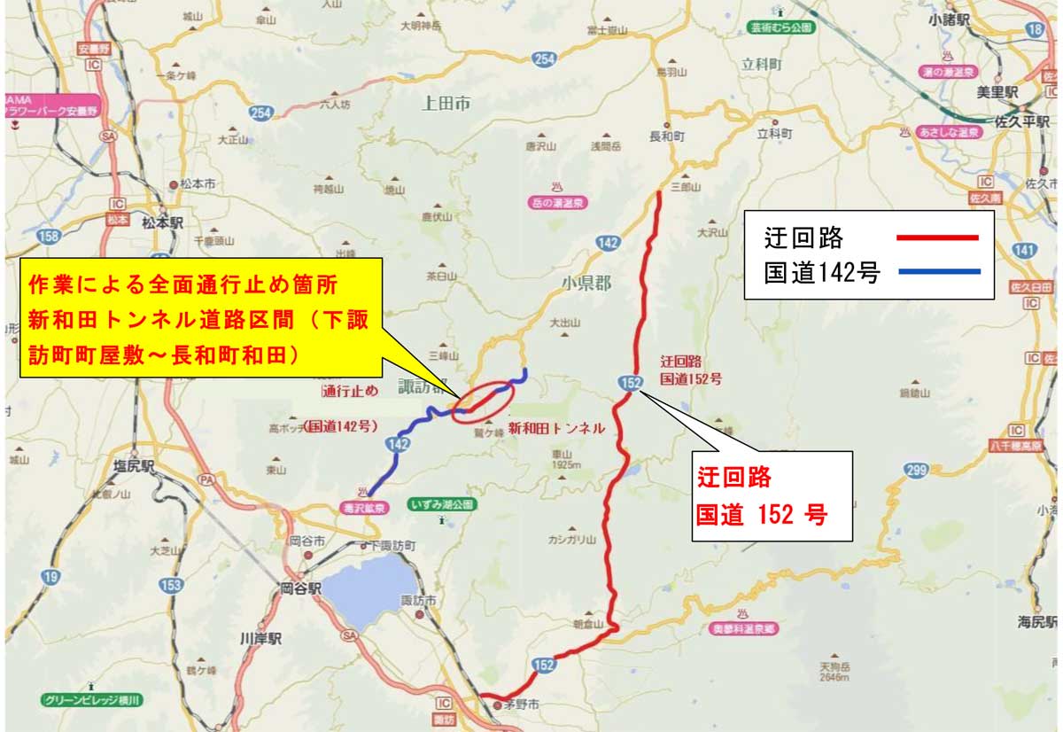 規制中は、新和田トンネル経由で佐久・上田方面、諏訪・岡谷方面には行けないため、国道152号(白樺湖~大門峠)に迂回する。