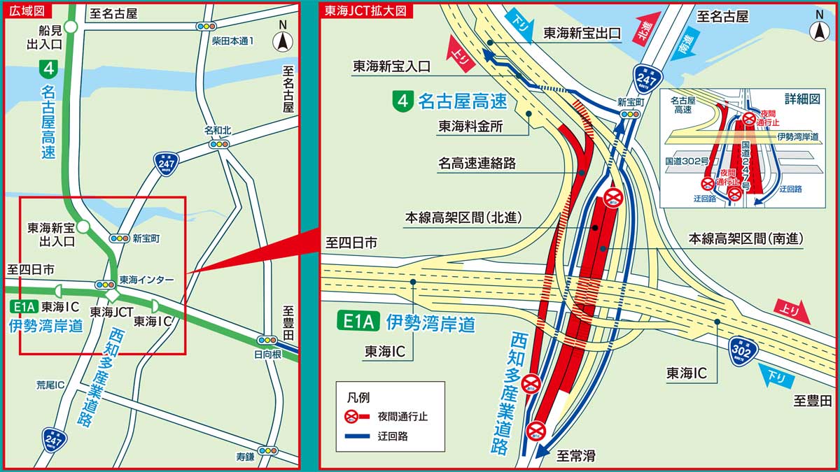 中部地方整備局愛知国道事務所は、4月21日(火)~5月12日(火)まで順次、東海JCT付近の国道247号西知多産業道路、名古屋高速4号東海線名高速連絡路で夜間通行止めを実施する。