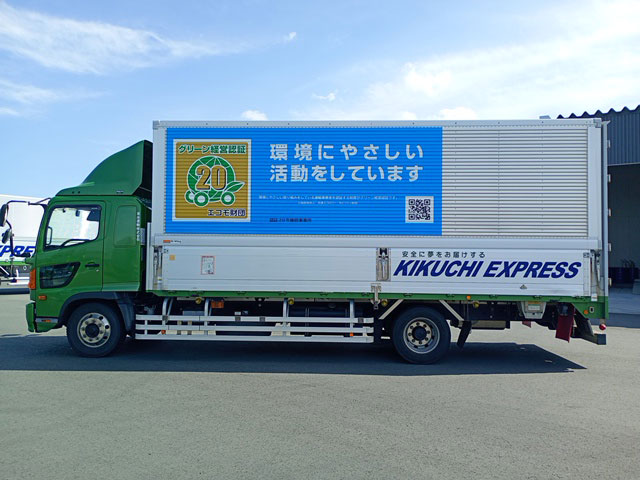 菊池運輸(東京都足立区)は、グリーン経営認証取得20年周年を記念したラッピングを豊橋支店の6tトラック2台に施し、運行を開始した。